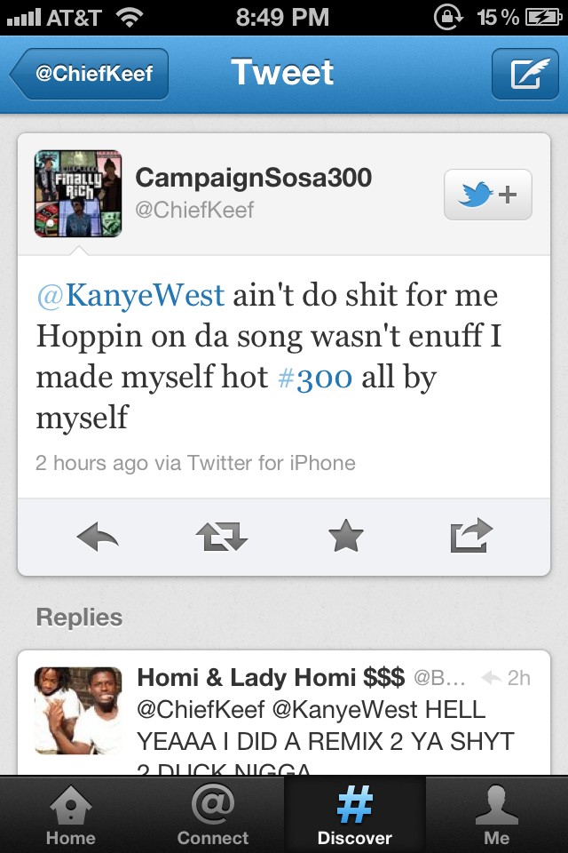 As we all know, Twitter went apeshit yesterday when the face of the drill music scene, Mr. Chief Keef so eloquently proclaimed that Mr.Kanye West ~~~~~~~~~~~~~~~>